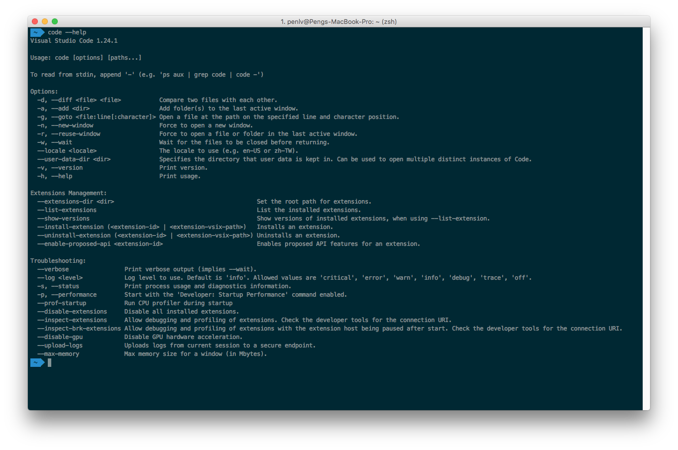 接下来,我们看一下 VS Code 的命令行都支持哪些操作,这里我先运行了 code --help