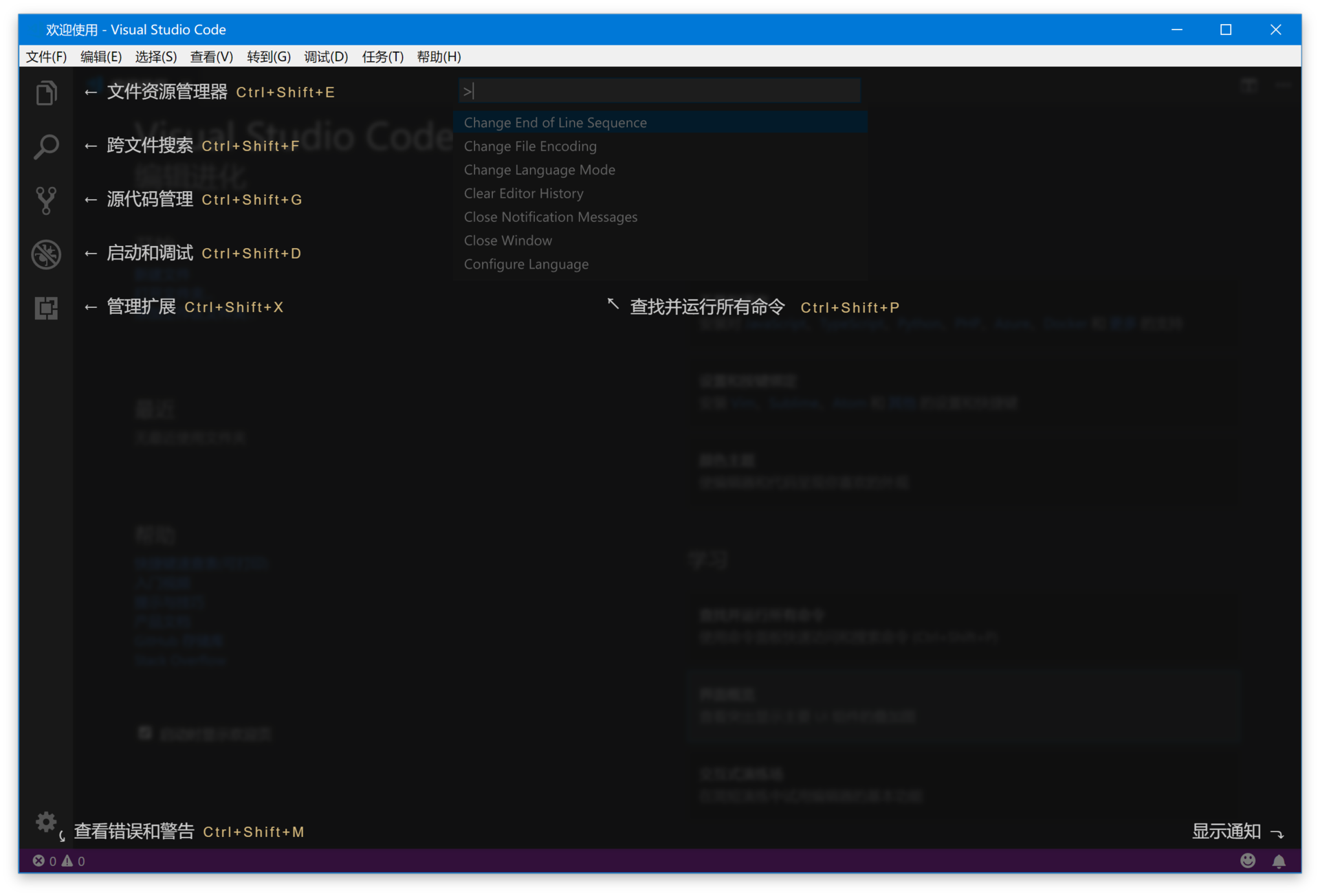 你可以在命令面板中快速搜索命令并且执行。如果你的 VS Code 是简体中文版,那么你可以在命令面板里使用中文或者英文来搜索命令。VS Code 的绝大多数命令都可以在命令面板里搜到,所以熟练使用命令面板,你就可以摆脱鼠标,完全通过键盘操作来完成全部编码工作。