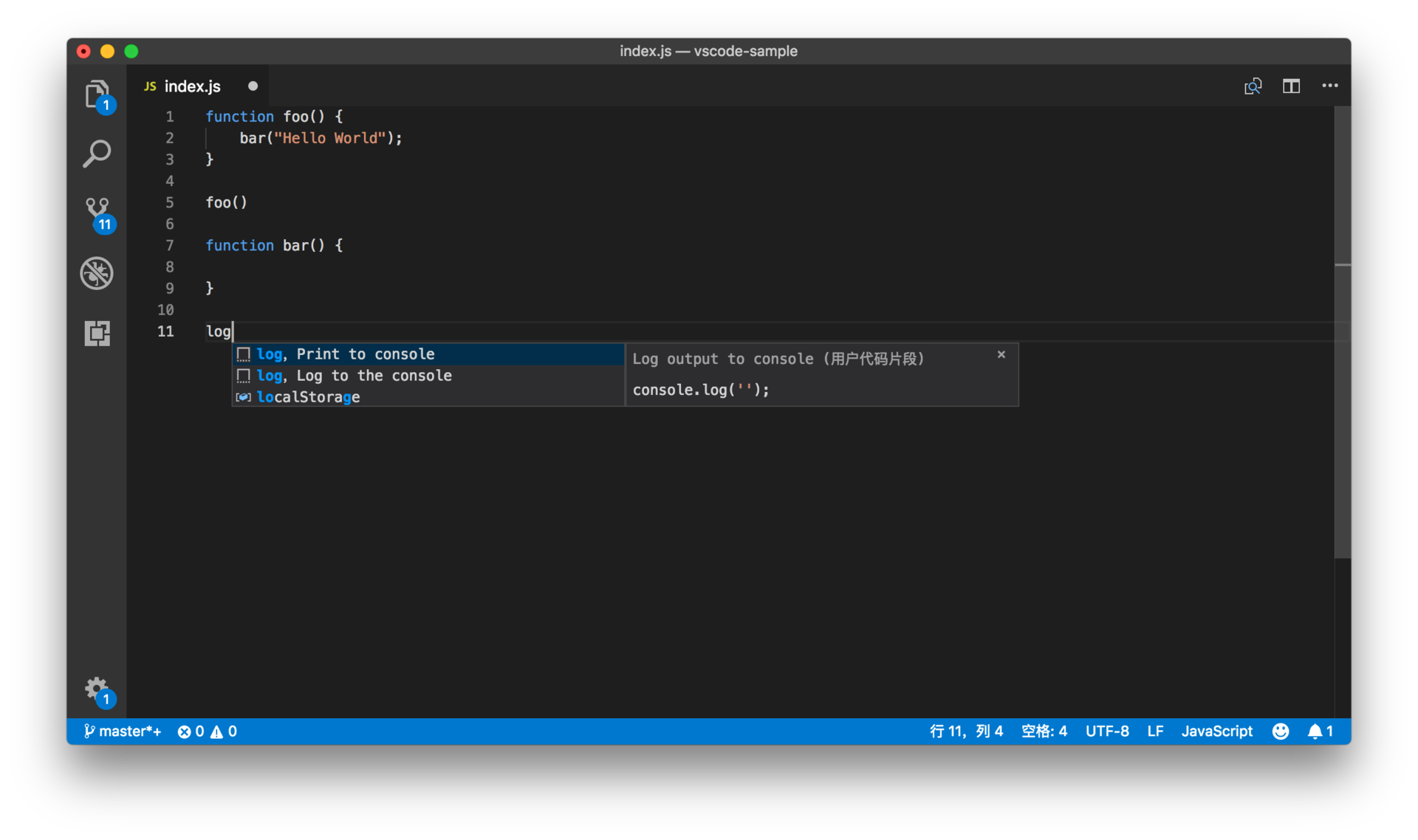 比如现在我们可以打开一个 JavaScript 文件(还以之前的一段代码为例),然后输入 log,你就能够在建议列表里看到 “Print to console”这个建议。