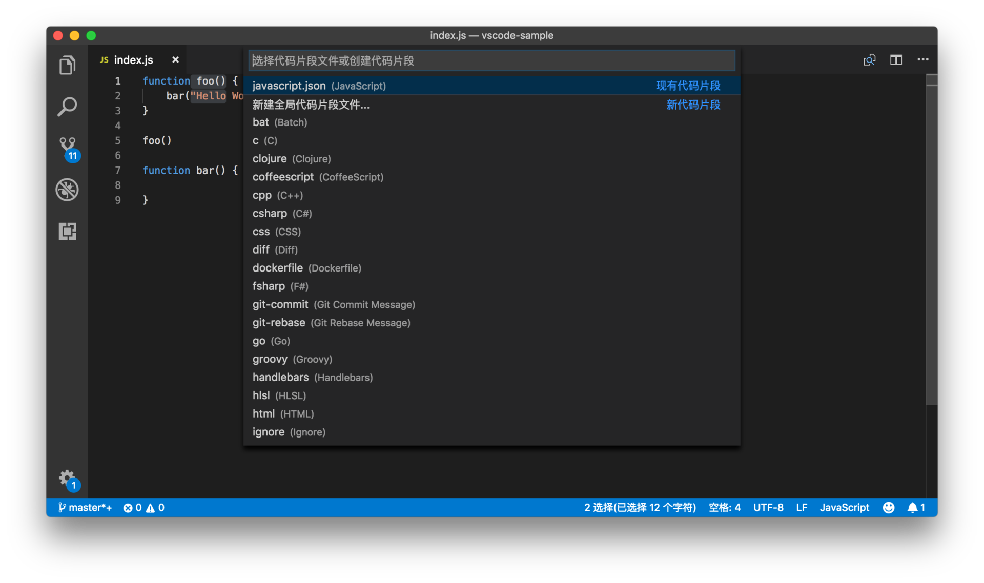 在下面的动图里,我们可以看到,代码片段被插入编辑器中后,光标就被自动地放到了引号的中间;我们输入 “bar” 后,按下了 Tab 键,光标就又自动地移动到了下一行的开头,然后我们就可以继续输入代码了。