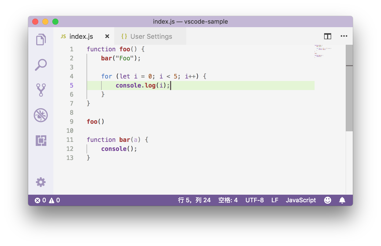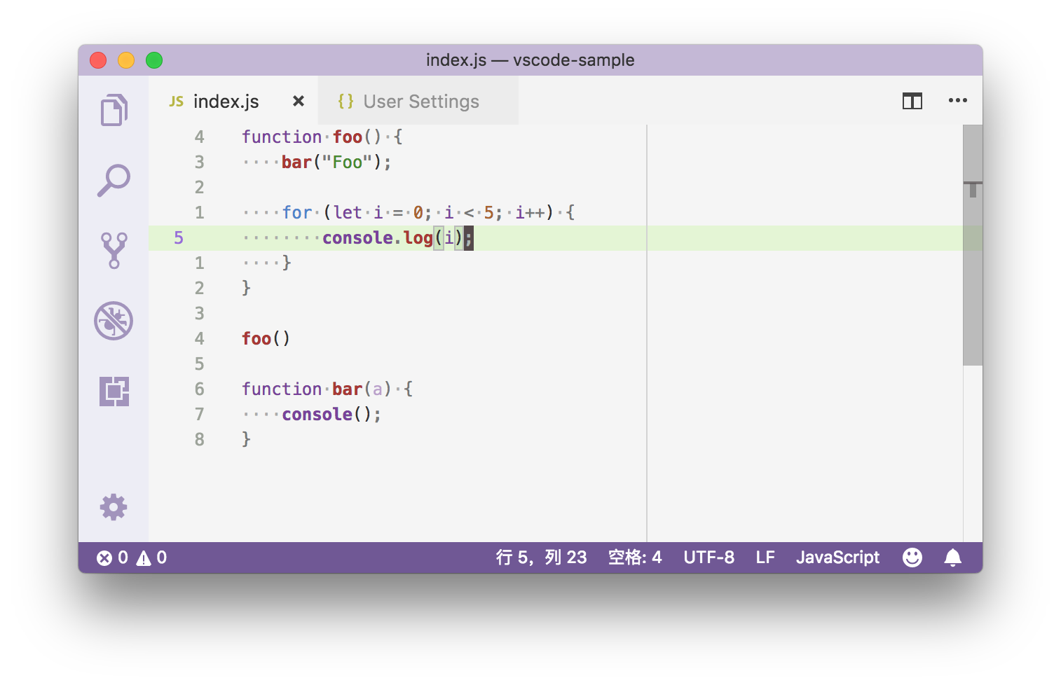 第三个比较明显的变化就是编辑器中间的几个竖线。在图1中,第二行到第六行代码的中间,从内到外你能够依次看到两个竖线。这两个竖线就是缩进参考线。编辑器会根据你指定的制表符的长度,来决定缩进参考线的位置。这样你就可以非常清楚地知道代码有没有正确地缩进,而且也方便你区分出不同代码块之间的层级关系。这个功能是可以通过 “editor.renderIndentGuides” 来控制开关的。