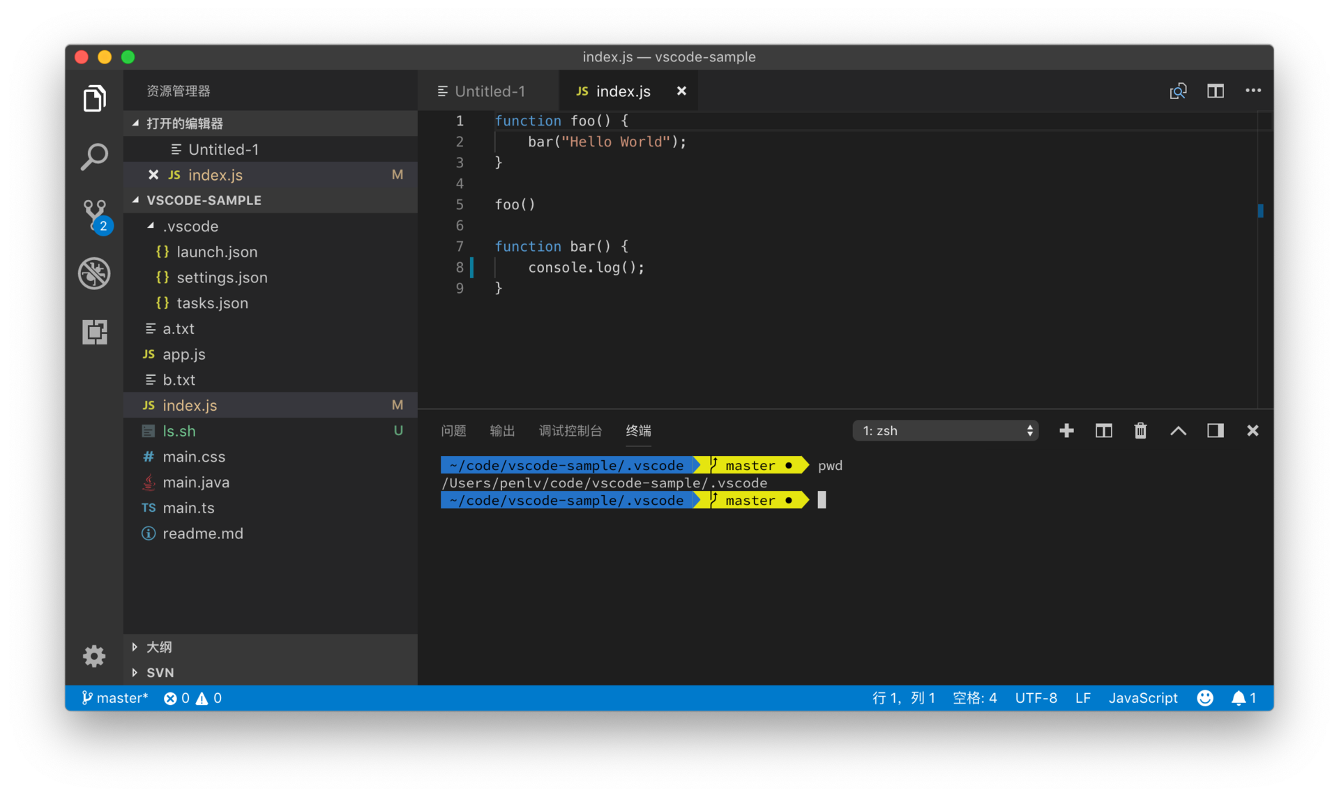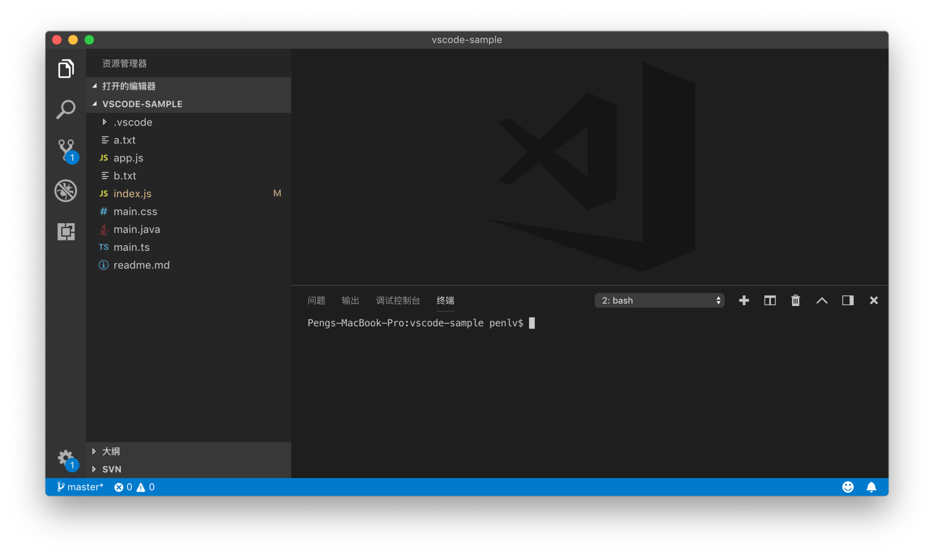 第一个就是优化终端的样貌了。每次我在社交媒体上分享了 VS Code 的截图,很多人都会问我,我的终端是怎么配置的。比如在下图中,我们能够轻松的看出,我的 Shell 现在是在 vscode-sample 这个文件夹下,同时这个项目是使用 Git 进行版本管理的,当前的分支是 master,你还能够看到特殊的符号。这里我使用的是 zsh 和 oh-my-zsh 插件,你也可以试试。对了,我在 Windows 上会使用 Posh-Git 来完成类似的效果。