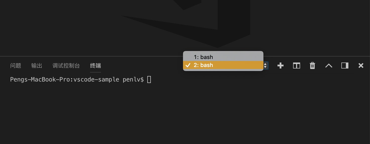 在这个面板的最上方,我们能够看到一个下拉框。下拉框里现在显示的是 “2:bash”,它的意思是,我们现在正在使用的是第二个集成终端,而它里面运行的是 bash。