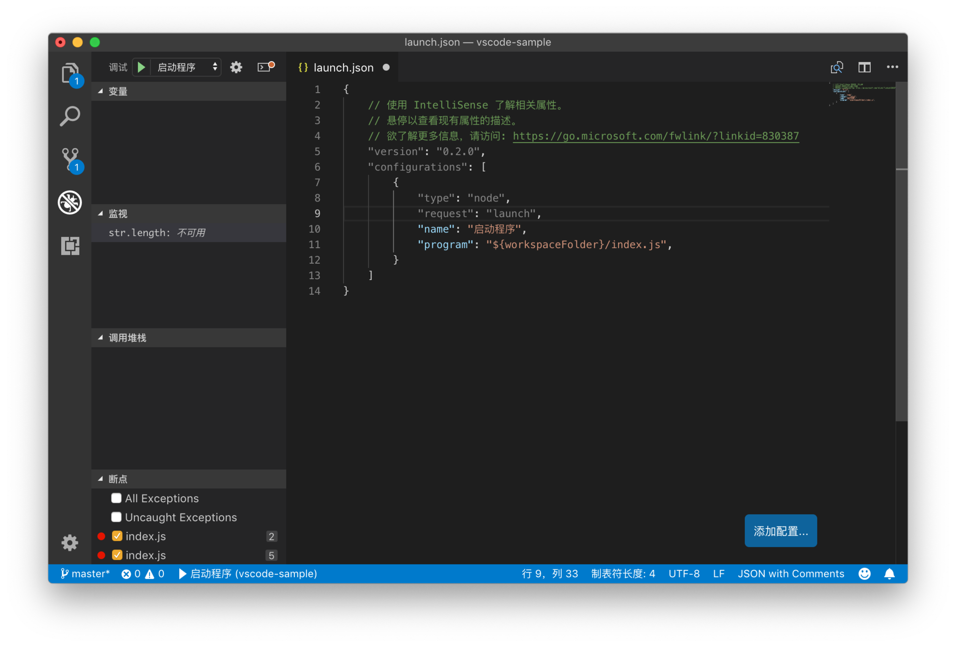 在没有任何配置的情况下,VS Code 的 Node.js 调试器,会尝试着去调试当前打开的文件,而如果当前没有任何的文件被打开的话,Node.js 调试器就不知道该调试哪个代码文件了。而且很多时候,我们的项目相对比较复杂,单个文件的调试还是相对太理想化了。为了解决这个问题,我们需要给 VS Code 提供一个配置文件,告诉调试器如何加载和调试代码。