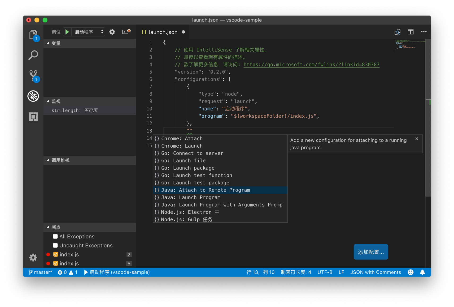 另一个能够帮助到我们的,就是在书写配置属性的时候使用自动补全功能。当我们在书写新的属性时,按下 Ctrl + Space,就能够唤出建议列表,建议列表里提供了当前调试配置里可以使用的所有属性,然后我们就可以按需选用了。