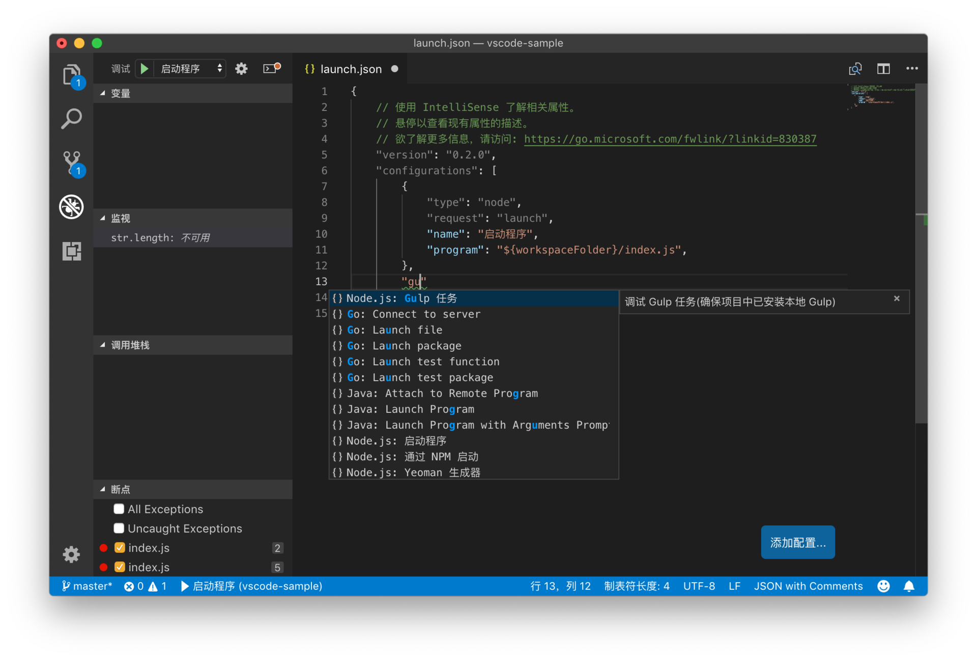 再或者我选择了 “Node.js: Gulp 任务“,它的作用是调试 Gulp 任务(Gulp 是 Node.js 的一个任务脚本工具),同时它还提示了我要确保项目里已安装本地 Gulp 脚本。