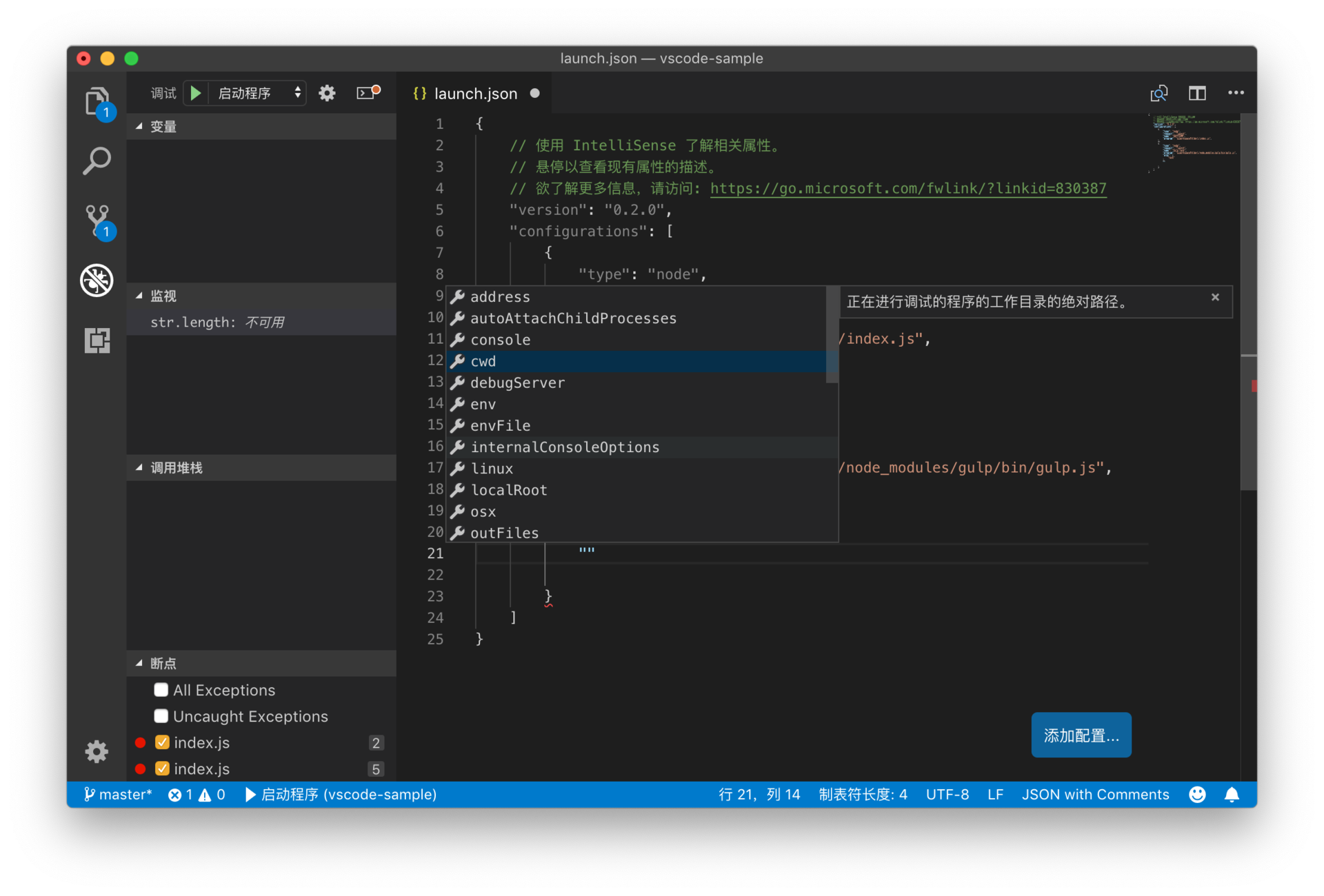 是代表当前工作区文件夹地址的预定义参数,使用它就能够准确地定位当前工作区里 index.js 文件了。(关于在配置文件里可以使用的预定义参数,请参考Visual Studio Code Variables Reference。 )