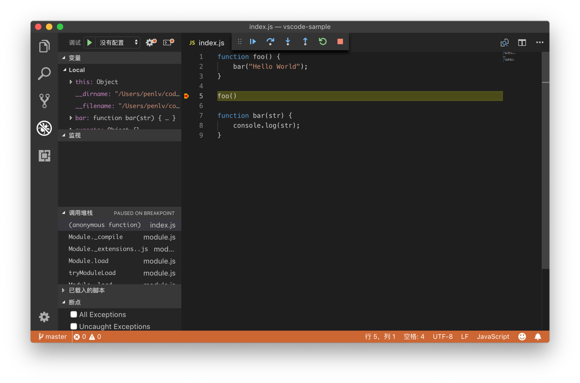 此时,当我们再次点击调试视图上面的绿色箭头按钮,或者按下 F5,启动调试器,并且选择 Node.js ,VS Code 就会进入调试模式。