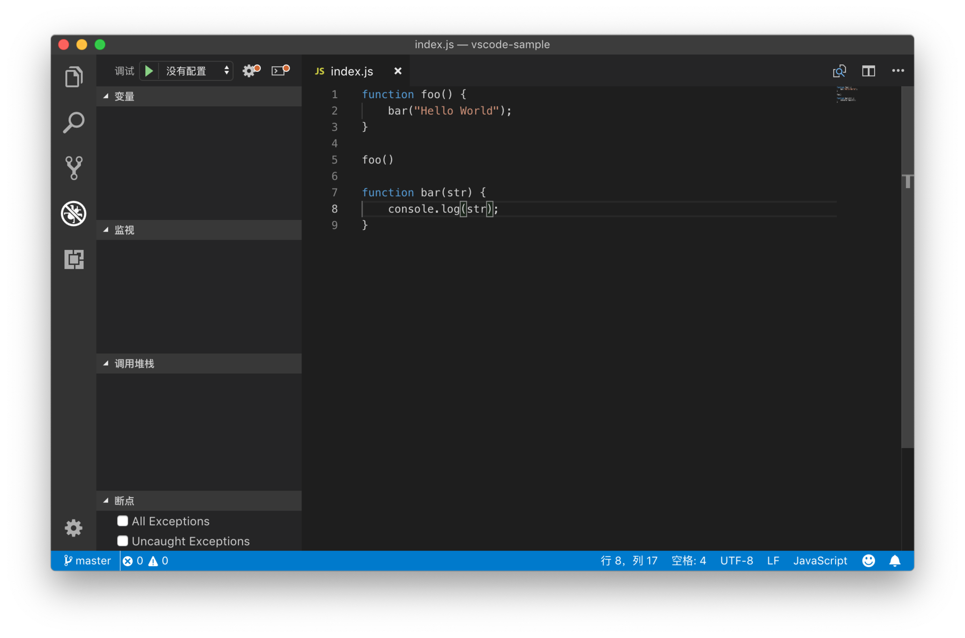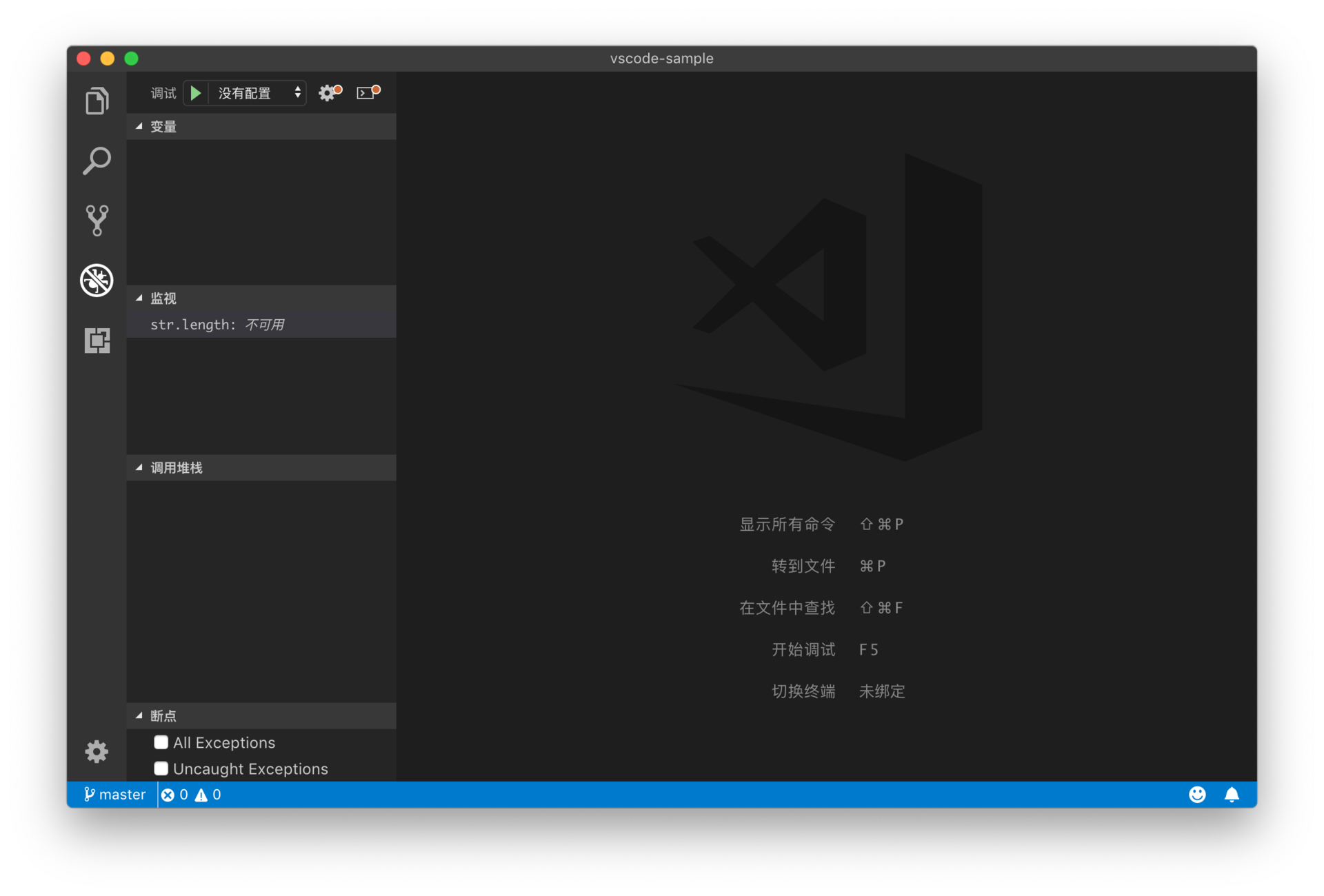 VS Code 中有一个专门的用于管理调试功能的视图。我们可以点击界面左侧“昆虫”(也就是 bug 啦)形状的按钮,或者按下 “Cmd + Shift + D” (Windows 上是 Ctrl + Shift + D)来唤出调试视图。