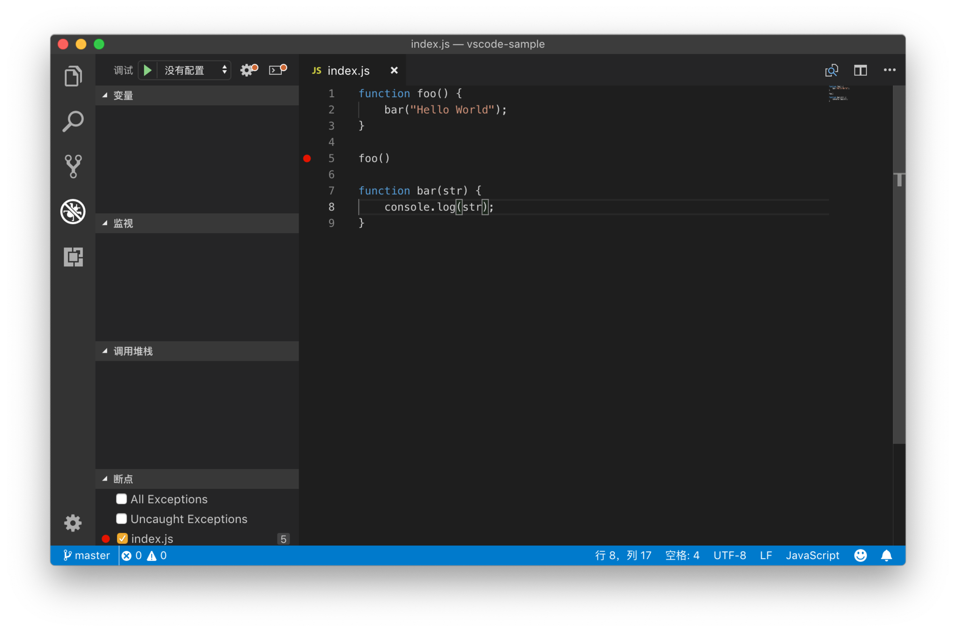到这一步,即使我们关闭掉编辑器里全部的文件,当我们按下 F5 ,也能够将 Node.js 代码调试起来了。