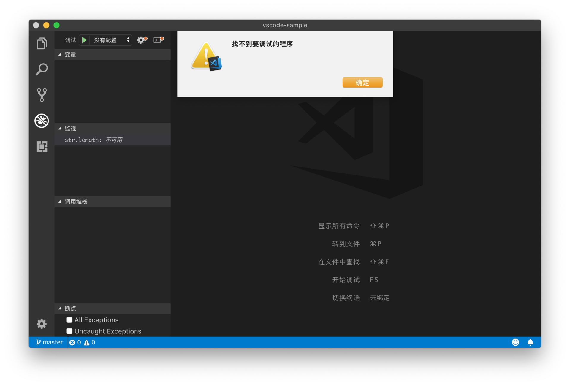 但是,如果工作区并没有任何打开的文件,那当我们再次按下 F5 进行调试,然后选择 Node.js 时,VS Code 会告诉我们 “找不到要调试的程序”。这句话什么意思呢?