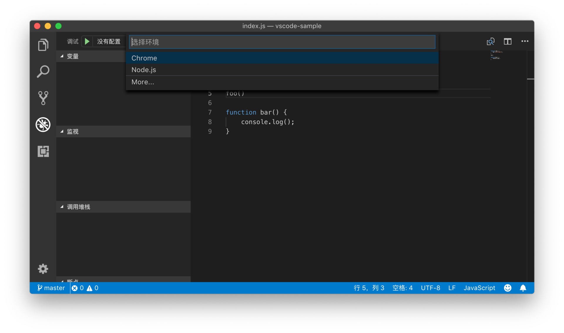这个列表有两个选项,一个是 Chrome,另一个则是 Node.js。其中,Node.js 的调试器是 VS Code 默认就支持的,而 Chrome 这个选项则是因为我安装了 Chrome 调试相关的插件 Debugger for Chrome - Visual Studio Marketplace 。 为了便于理解,这里我会选择 Node.js 。