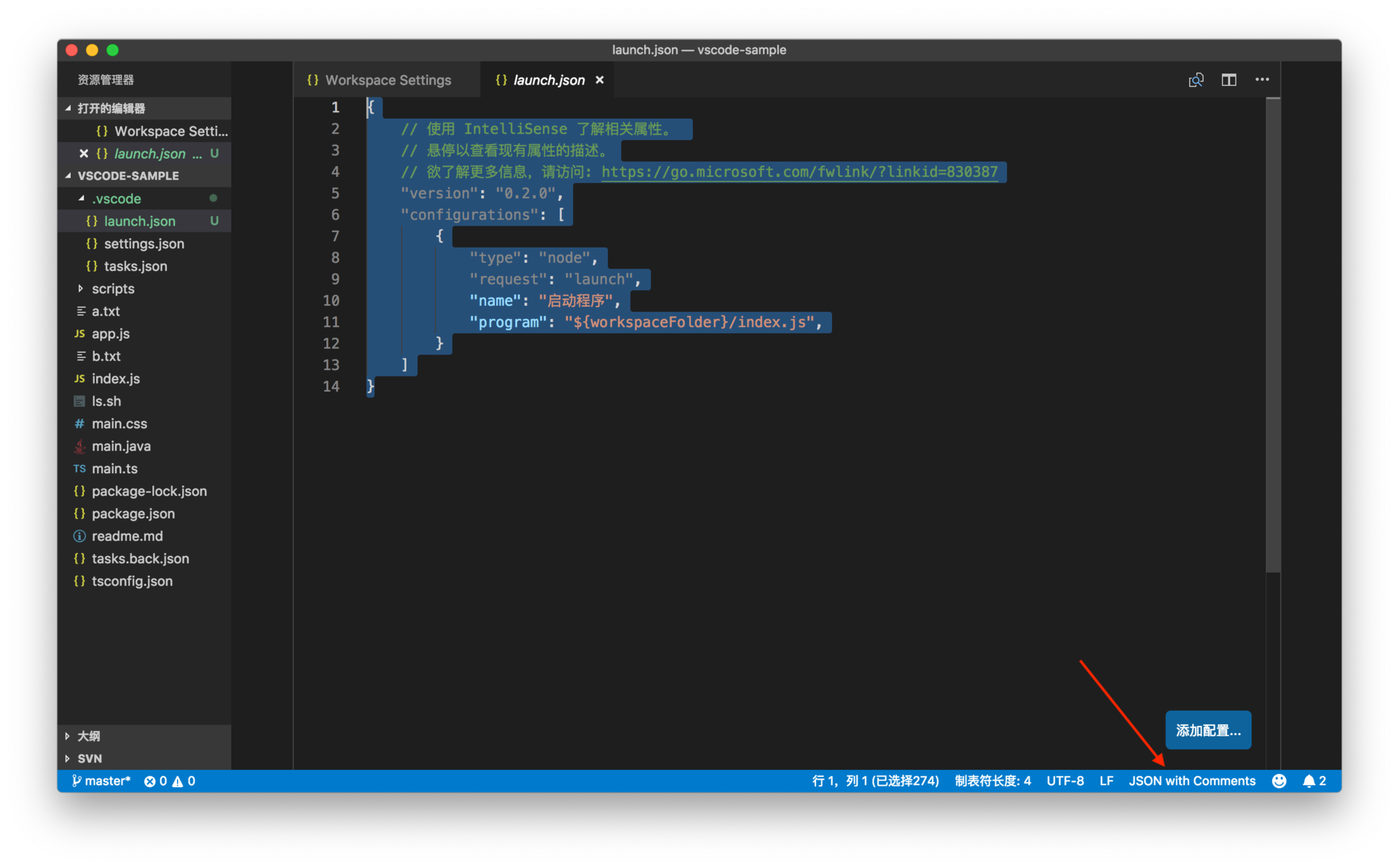 这是因为 VS Code 为配置文件们都指定了一个特殊的 JSON 文件类型,称为JSON with Comments。你可以在状态栏的最右侧看到 VS Code 的这个特殊的语言类型。