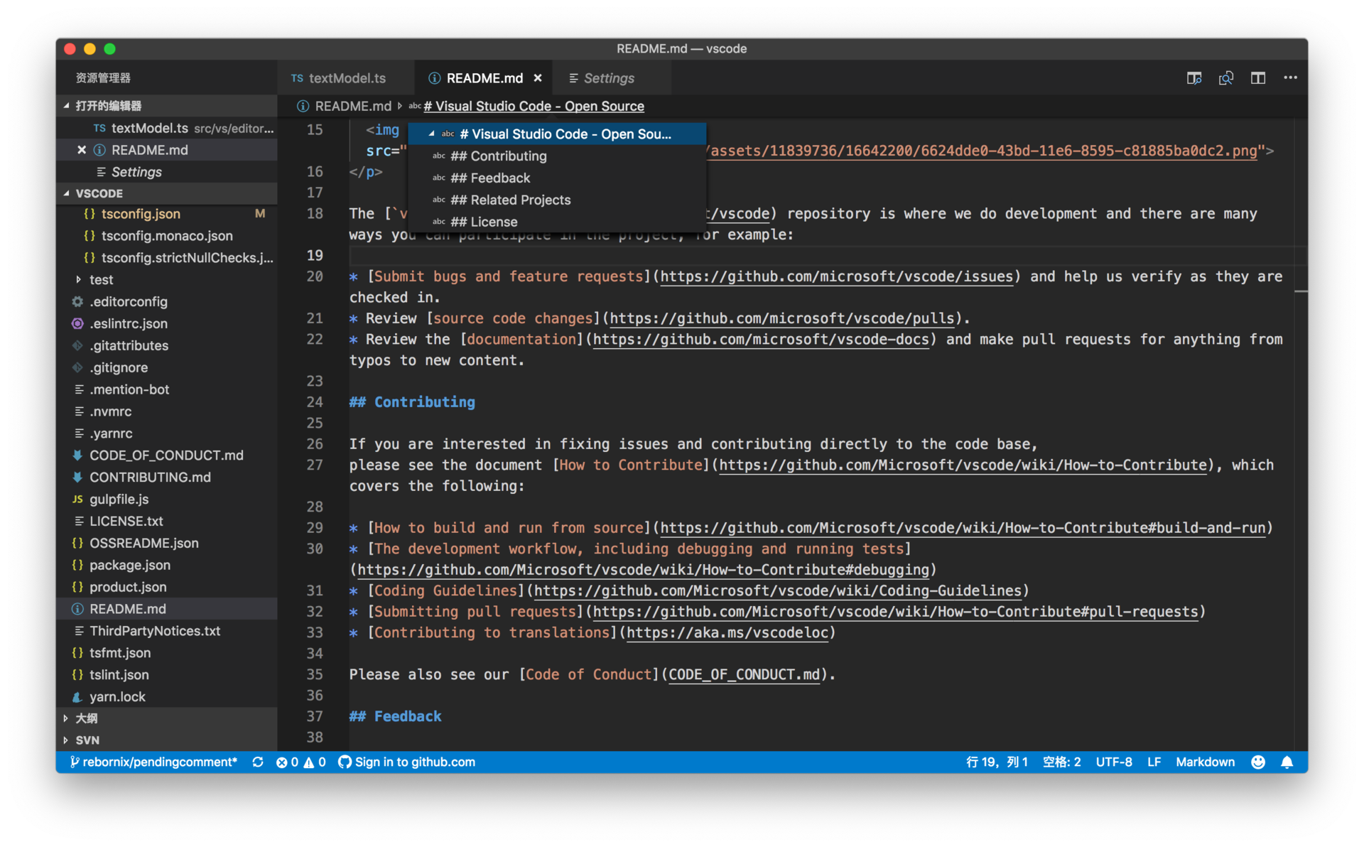 说完 JSON,我们再来看看另一个 VS Code 支持的非常好的语言——Markdown。Markdown 在近些年已经成为了主流的文档书写语言,比如GitHub 上的项目 readme 默认就是 Markdown,微软在13年也把 MSDN 的文档从 XML 逐步地转为 Markdown 了。