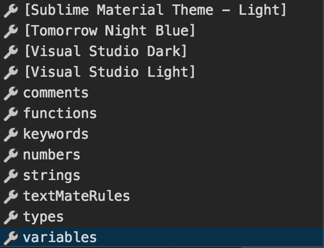 通过选择这些主题,你可以只针对它们做颜色修改,而不影响其他的主题的颜色。工作区的颜色修改也是如此。比如说,你想修改 Monokai 的某个颜色定义,那么你可以这么写: