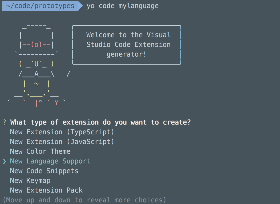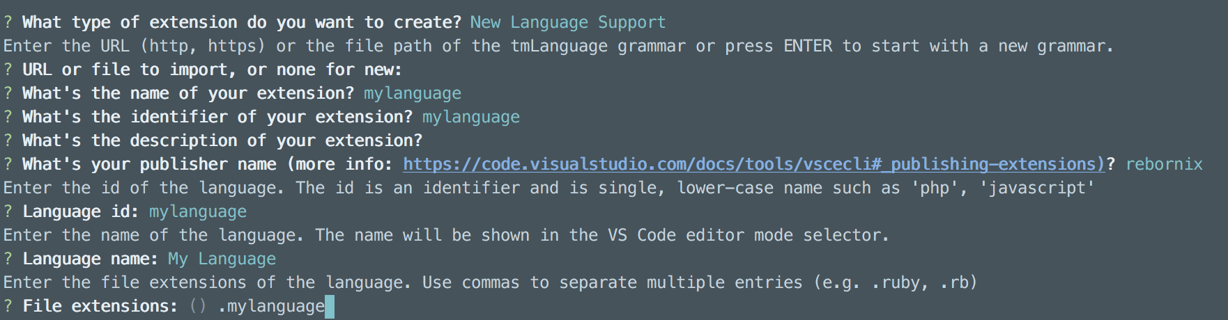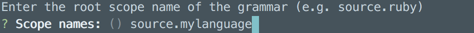 最后脚手架工具问了一个跟 tmLanguage 有关的问题,就是指定这个语言的 scope name。我们依葫芦画瓢,就叫它 source.mylanguage 好了。