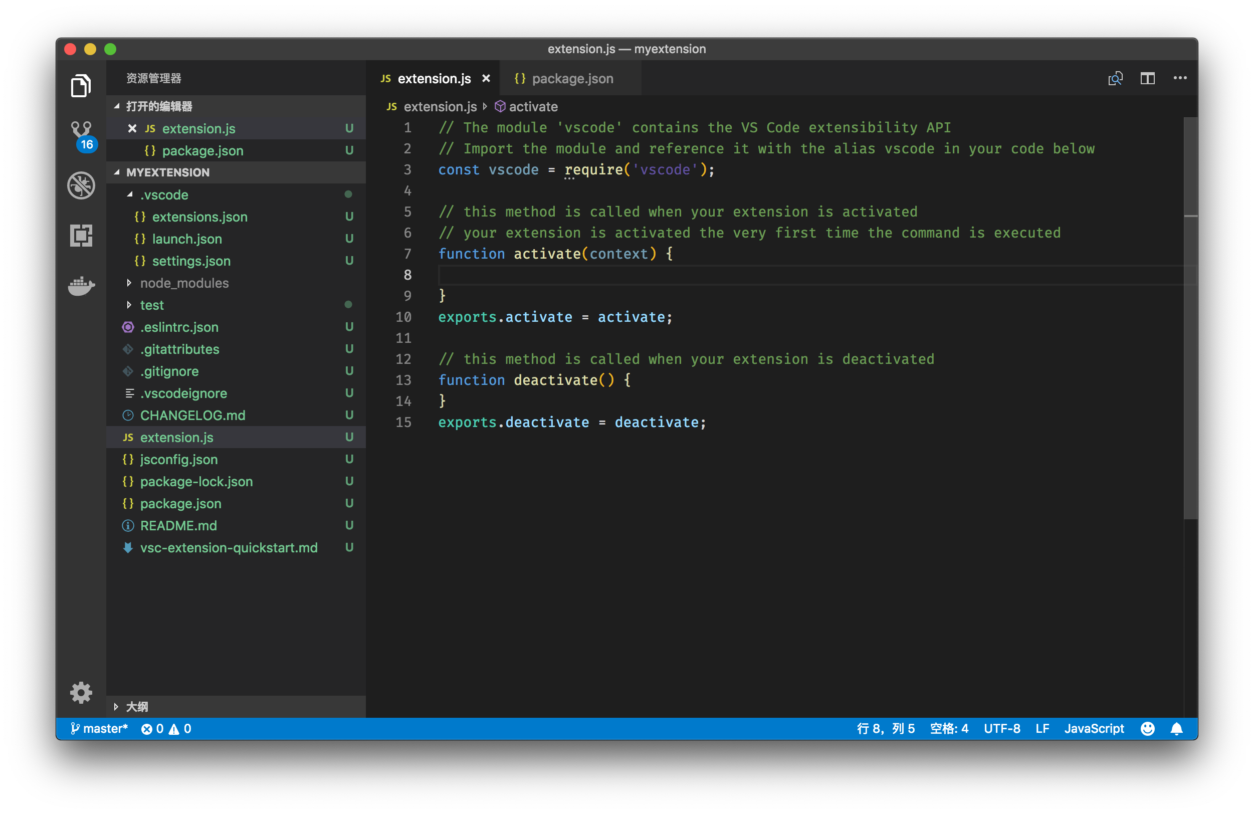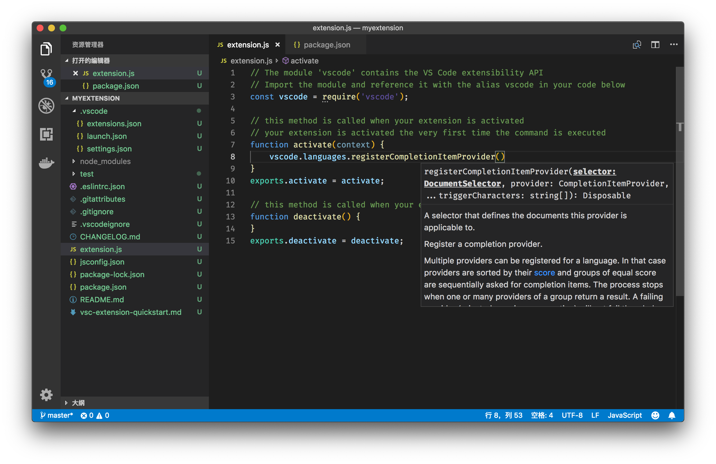 下面,我们就来看看,如何实现一个实现了自动补全的插件。我们还是沿用《插件开发(一):why、how 和 what》里的那个插件模板。这个插件只有一个代码文件,就是 extension.js 。