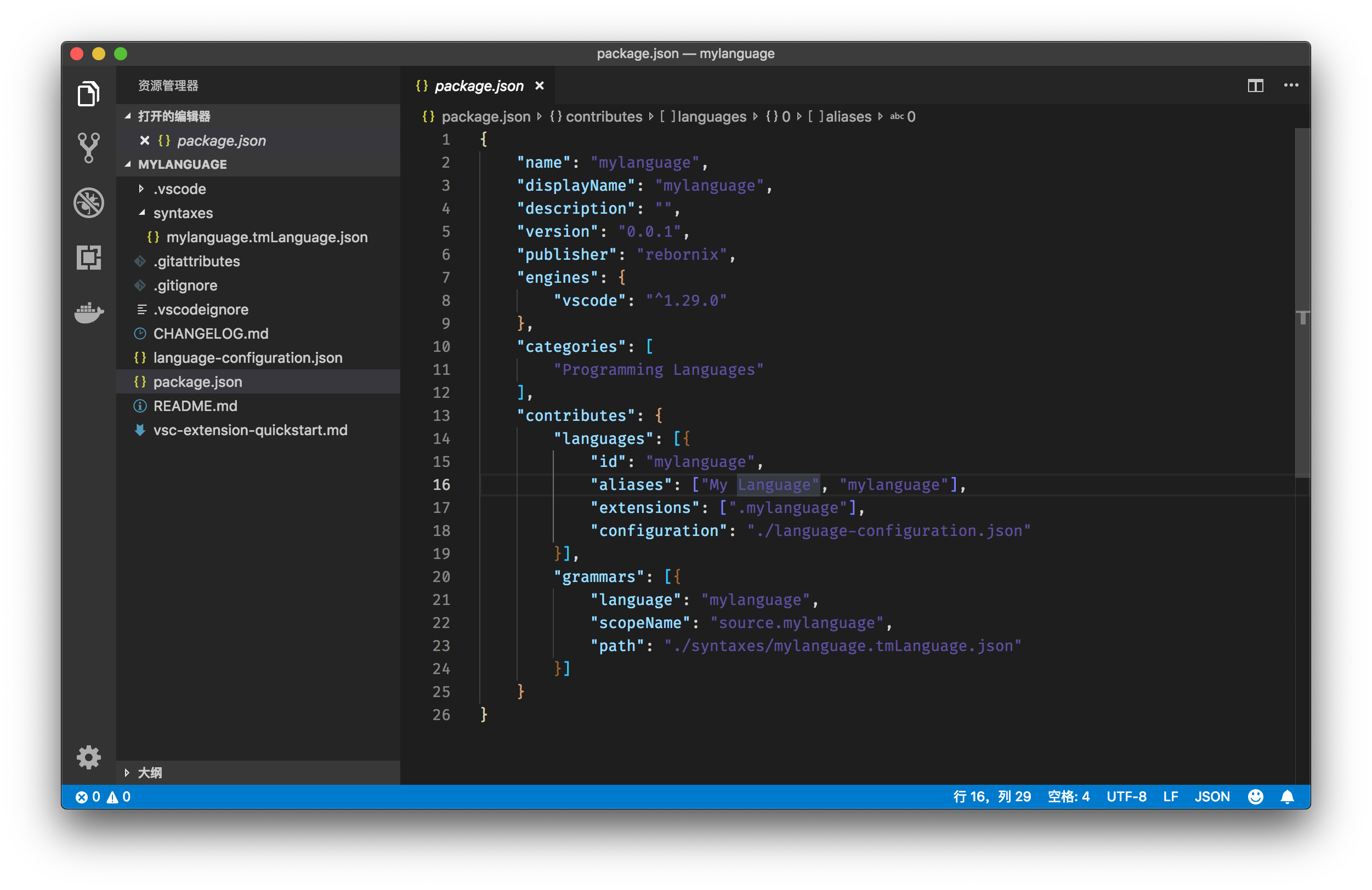通过 package.json 中 contributes 的值,我们可以发现这个插件注册两个信息。一个是 tmLanguage,用于语法高亮。另一个是 languages,也就是 mylanguage 这个语言的信息。它的信息包含以下几点: